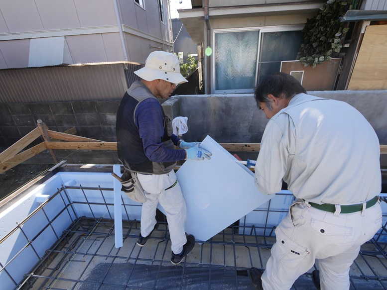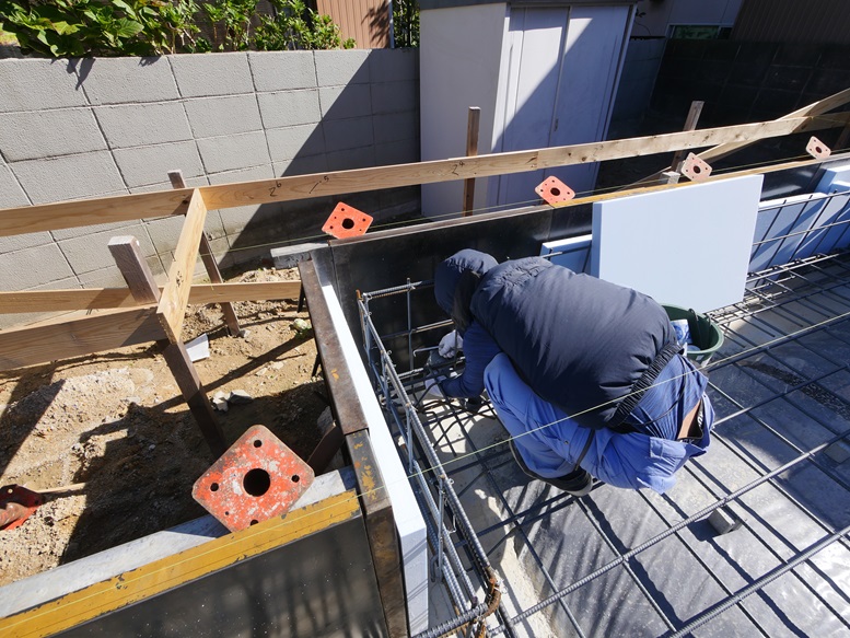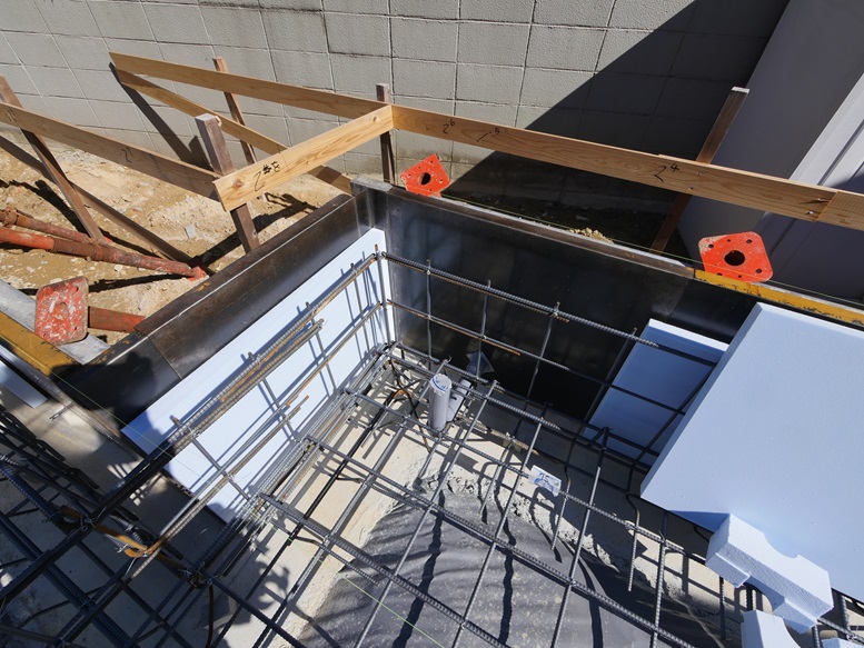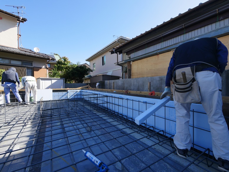 基礎の配筋工事完了後、基礎外周部分=外気に触れる外側に断熱材を施工します。