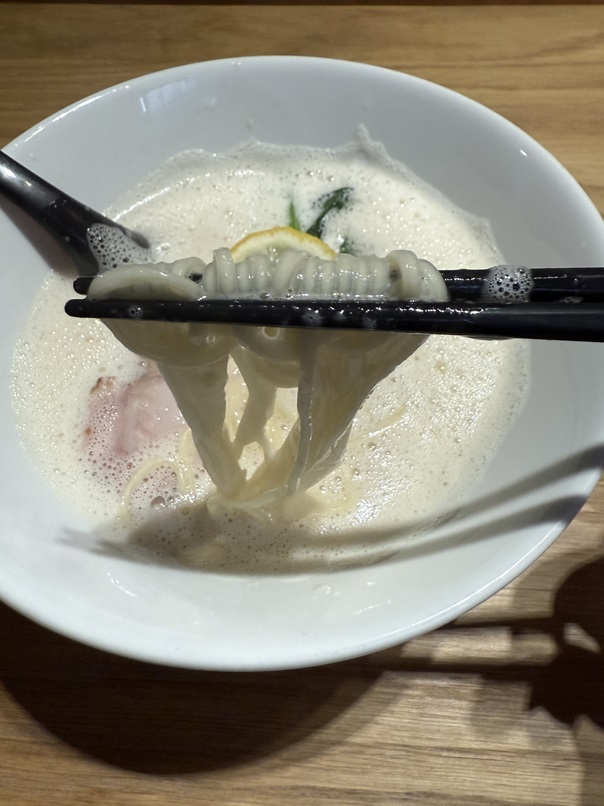 細くてコシがありのど越しがいい麺に白湯スープが良く絡み、麺の美味さとスープの美味さが二乗してお口の中にやって来ます。