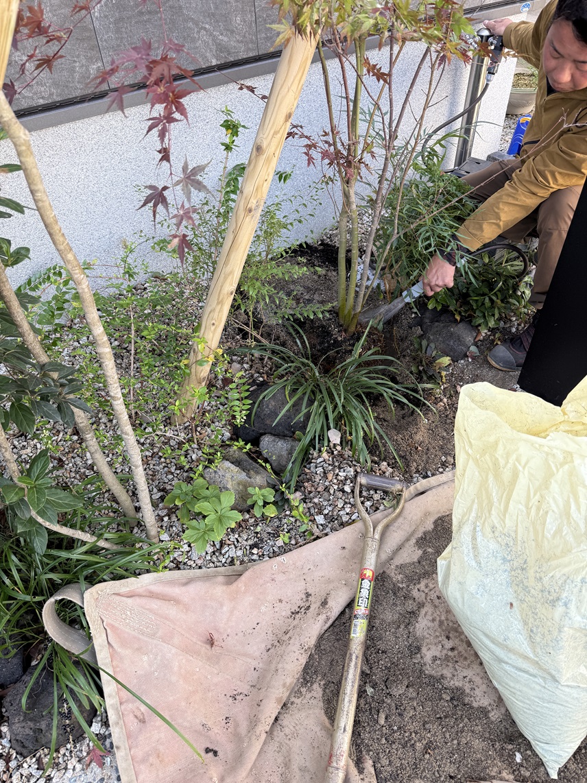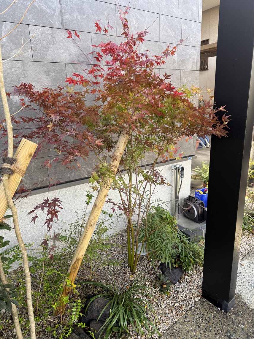 植木屋さんおススメのイロハモミジをお客様にご提案し、ご納得いただいて植え替えです。