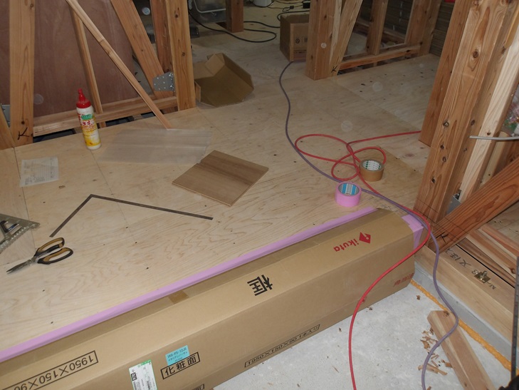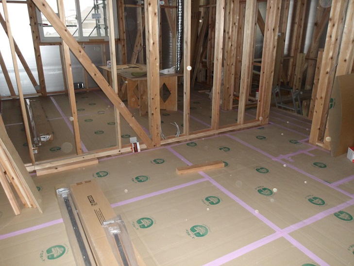 2階の床張り完了です。張り終えたこところは工事中のキズ汚れ防止の養生完了しました。