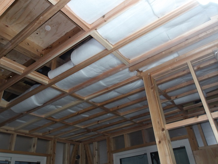 天井にポリウールを施工し2階に音が響くのを防ぎます。