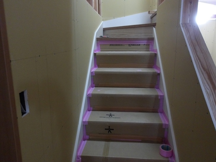 ここまで工事が進むと工事中のキズ汚れ防止の養生をします。