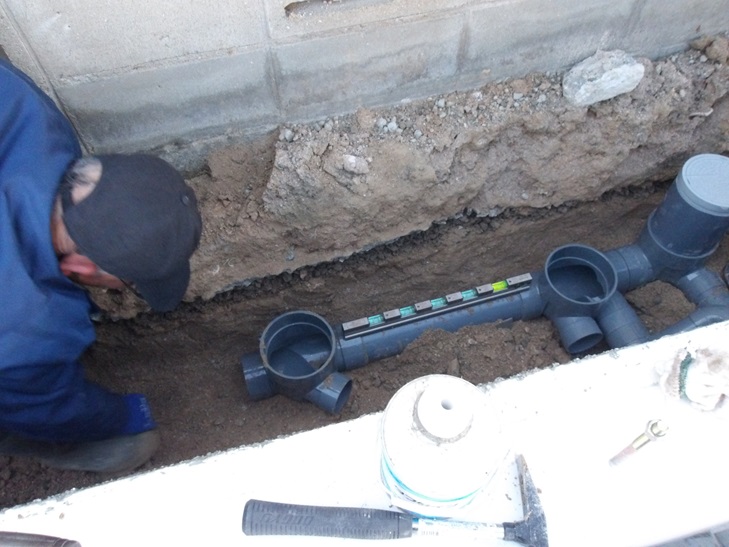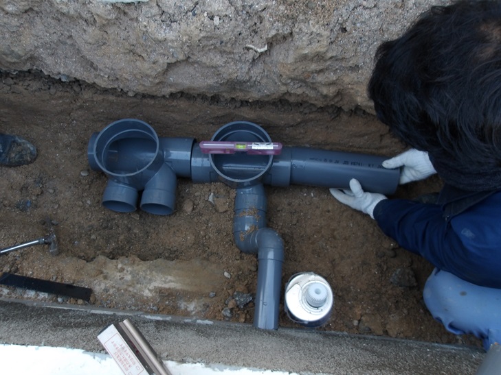 家から市道に埋設されている下水道本管に流れるように勾配を考えて施工します。
