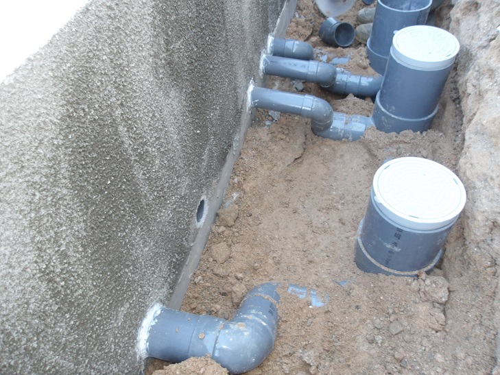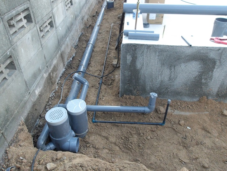 水道管、排水管、そして敷地に降った雨を道路の側溝に逃がす雨水管を基礎周りの敷地に施工します。