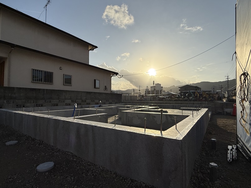 弊社がつくる基礎は、基礎コンクリートを暑さ寒さや雨風や紫外線から守る為に、外部に断熱材を施工した基礎です。