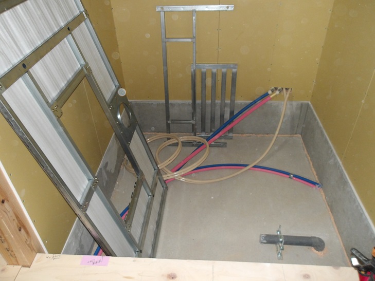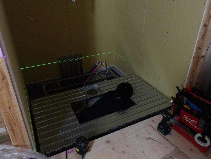 設置前に給排水の配管工事と防火のため(省令準耐火対応)の石膏ボード張りを完了させておきます。