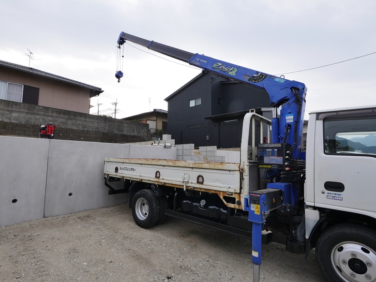 今回の敷地は、駐車場部分と家部分の土地に高低差があるのでユニック車で地盤調査の機械を吊り上げて調査しました。