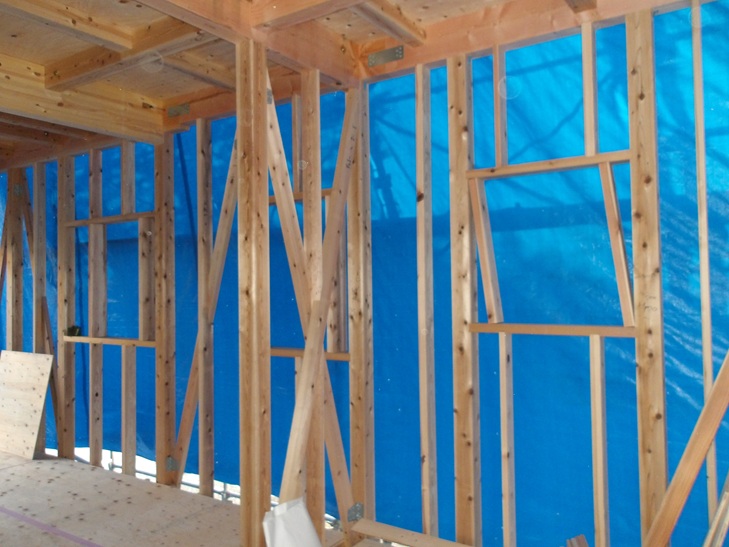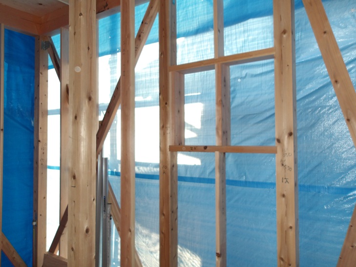 1号、上棟後筋交い間柱窓枠の取り付けです。