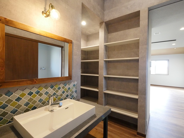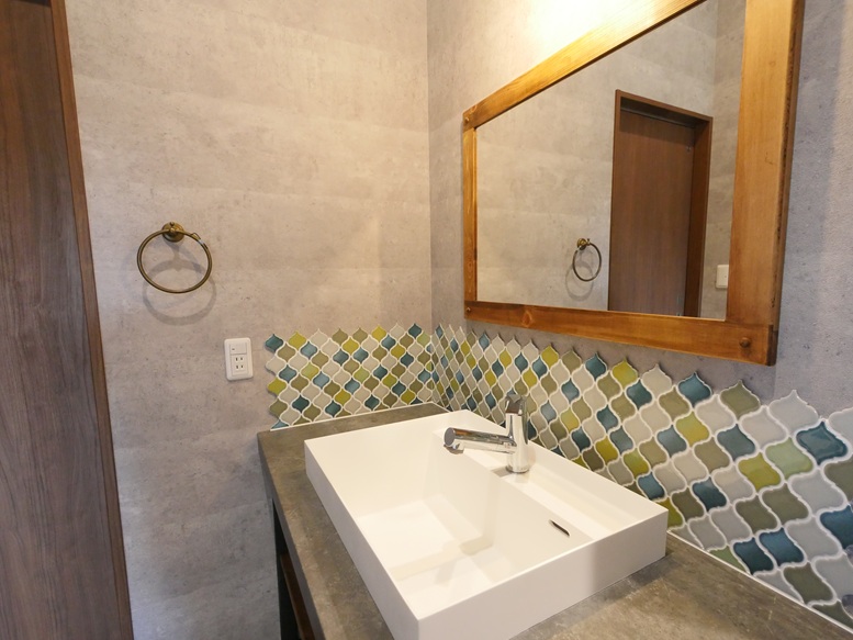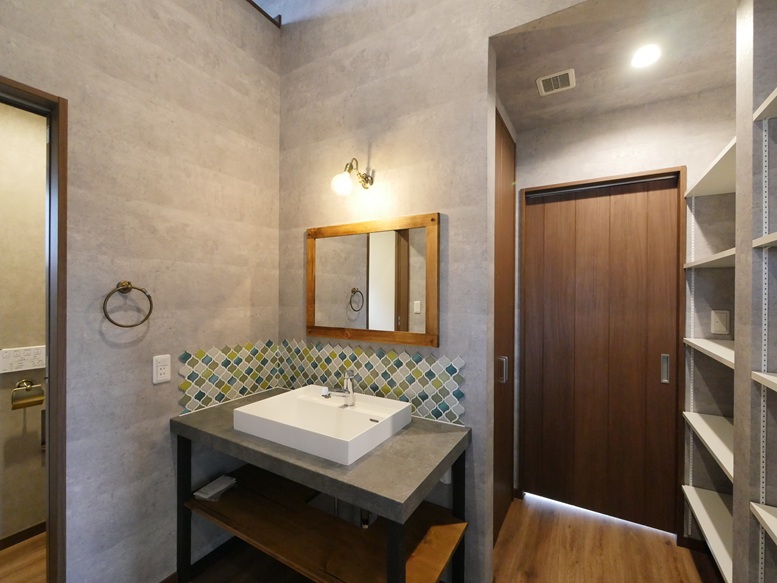 カウンター、洗面ボウル、水栓、鏡、照明とお客様と打ち合わせをして作った洗面所です。