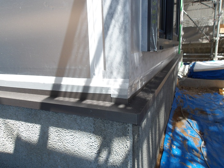 防水工事は、基礎上部に水切り板金を取り付けて断熱材と水切り板金の上部に防水テープを貼ります。