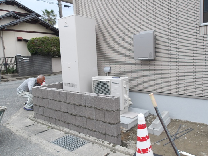 敷地の角、エコキュート部分に化粧ブロックを施工します。