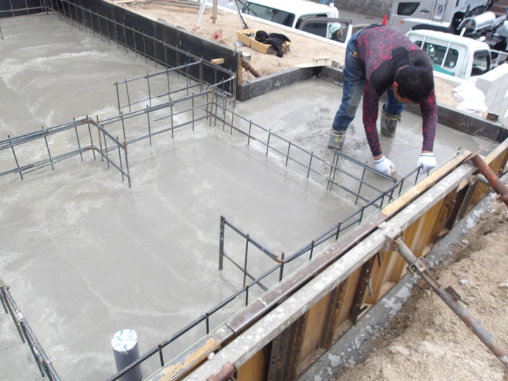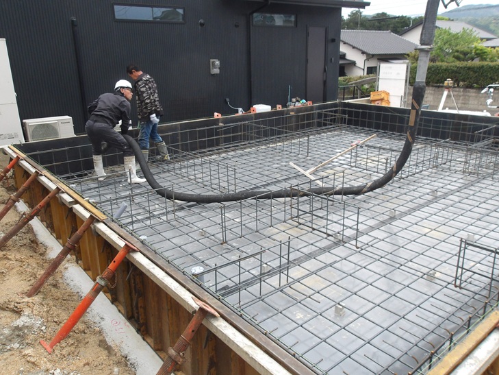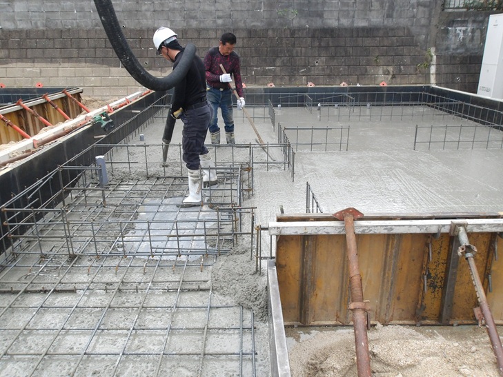 ポンプ車を使いコンクリートミキサー車が運んできたコンクリートを基礎のベタ部分(ベース、底盤)に流し込みます。