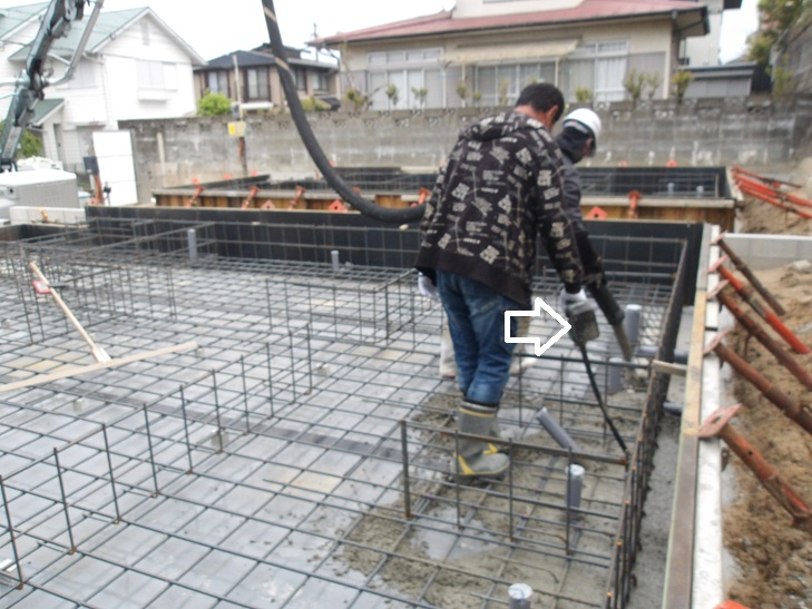その際に矢印のバイブレーターという器具を使いコンクリートが隅々まで気泡ができずに施工できるように作業します。