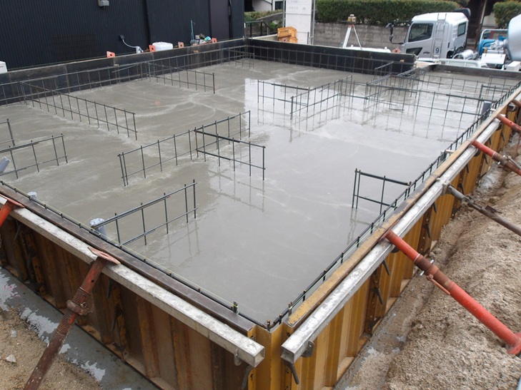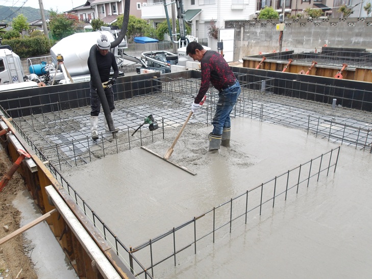 基礎全体にコンクリートを厚さ150mm以上になるよ流し込みました。
