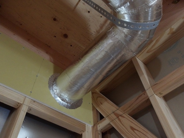 換気扇ダクトとファイアーストップの取り合い部分、隙間できないようにアルミテープを貼ります。